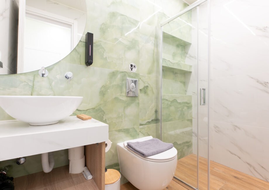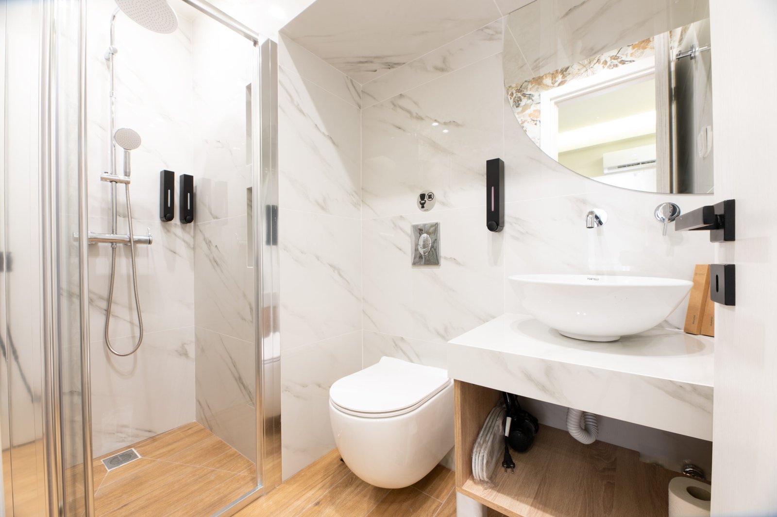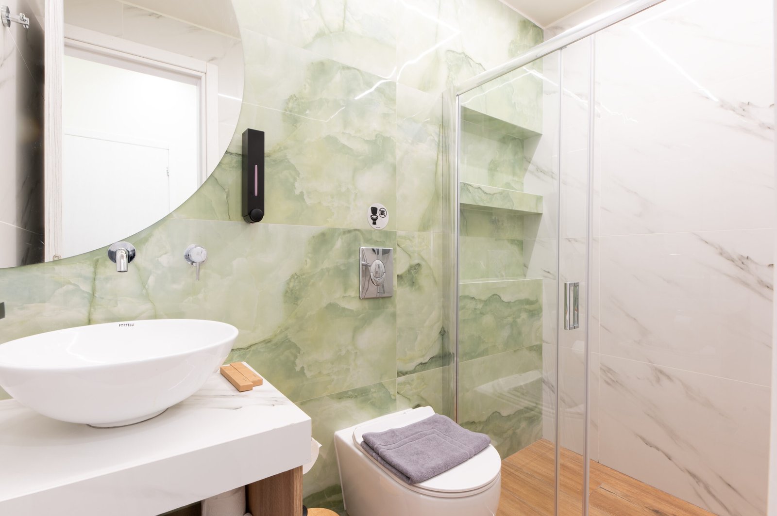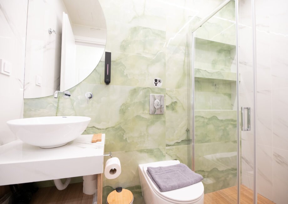 Το μπάνιο, με τον κομψό και λειτουργικό του σχεδιασμό, προσφέρει όλα όσα χρειάζεστε για να φροντίσετε τον εαυτό σας, με καθαρές και σύγχρονες εγκαταστάσεις που εξασφαλίζουν άνεση και ευχάριστη χρήση. Θα βρείτε βαμβακερές, αφράτες πετσέτες για την απόλυτη άνεσή σας, σεσουάρ μαλλιών, καθώς και προϊόντα προσωπικής φροντίδας όπως σαμπουάν, αφρόλουτρο και οδοντόβουρτσες μιας χρήσης. Για τη μέγιστη άνεσή σας, το διαμέρισμα παρέχει επίσης παντόφλες μιας χρήσης.